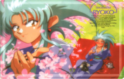 Ryoko Ah, Ryoko. One of my favorite characters in the U.S series. Ryoko has an unclear past in the U.S. episodes, as they point out vaguely that she used to be some type of relentless space pirate, one of the most feared in the universe. When she's at Tenchi's house though, she seems pretty cool. She's got special powers, like the ability to walk through walls and shoot balls of energy at enemies. Her personality is more of the laid back type...a carefree life. Ryoko is fully in love with Tenchi, and I wouldn't be surprised if she went to all ends of the Earth just to gain Tenchi's love in return. |